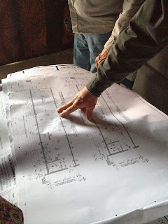 In an amazingly short amount of time, the pairs of workers headed out into the rain to their panel vans to "figure up" some numbers for Contractor Steve by Friday. Turns out Contractor Steve was holding out on the best for last because he picks up one of the 18,000 boxes in there and pulls out our plans! We immediately squealed and ran out into the light for many pics: